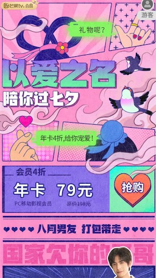 七夕节芒果tv会员举办的是以“以爱之名,陪你过七夕”优惠活动,年卡限时4折优惠,只需要79元就可以开通一年,开通后秒到账,芒果tv*方举办的活动,限时2天,随时结束,过期恢复198元一年的价格