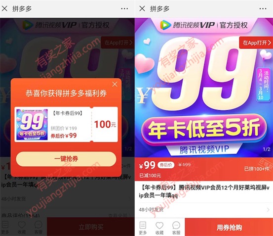 拼多多5折腾讯视频vip会员怎么购买?拼多多的大东家是腾讯,目前在拼多多只需要99元即可购买1年腾讯视频vip会员,购买前需要领取100元的优惠券,不领取优惠券的话还是199元的,所以建议进入活动页面先领取100元券在进行购买,这个是自动充值的秒到账,有奖之家的网友去试试吧。